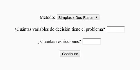 Al ingresar nos encontraremos primero con una pantalla que nos pide elegir el método de resolución, las variables de decisión y las restricciones involucradas. Dejamos método Simplex / Dos fases y completamos los campos de abajo según el modelo matemático que estamos resolviendo. Luego hacemos click en Continuar.