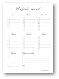 Este planificador semanal incluye secciones para cada día de la semana, incluyendo sábados y domingos. Por cada uno de estos días, puedes agregar cinco ítems, que pueden ser tareas o recordatorios.