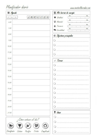 El objetivo de este planificador diario es que organices tu día de forma óptima, estableciendo tus objetivos, agendando tus actividades, anotando tus tareas pendientes y añadiendo recordatorios e ideas.