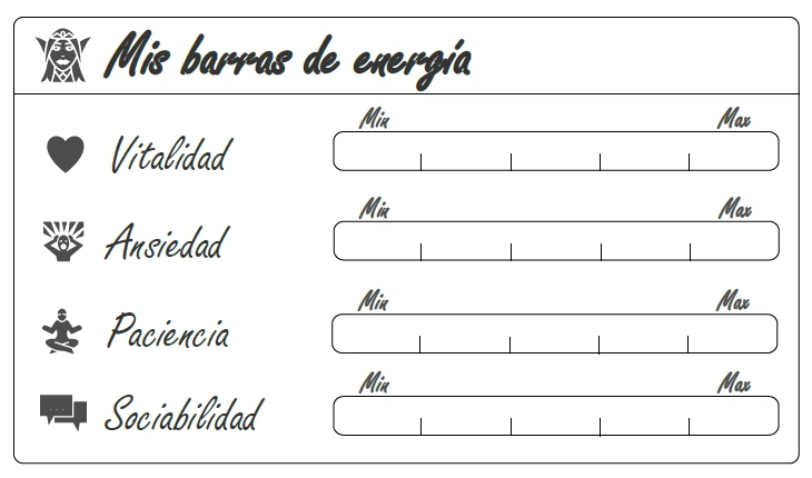 - Barras de energía: vitalidad 💖, ansiedad 😱, paciencia 🧘 y sociabilidad 😁.