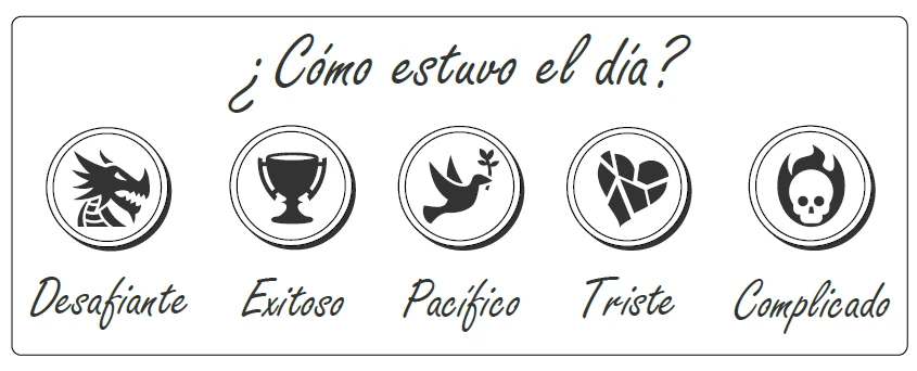 - Bloque de cierre del día con un resumen. Determina cómo estuvo el día: desafiante 🐉, exitoso 💪, pacífico 🕊️, triste 😢 o complicado 🔥.